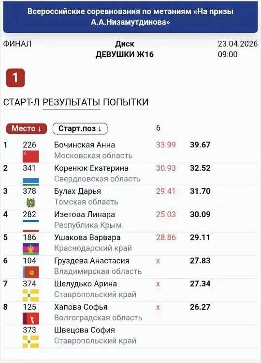 23-24 апреля 2026 года в Сочи прошли Всероссийские соревнования по метаниям на призы А. А. Незамутдинова